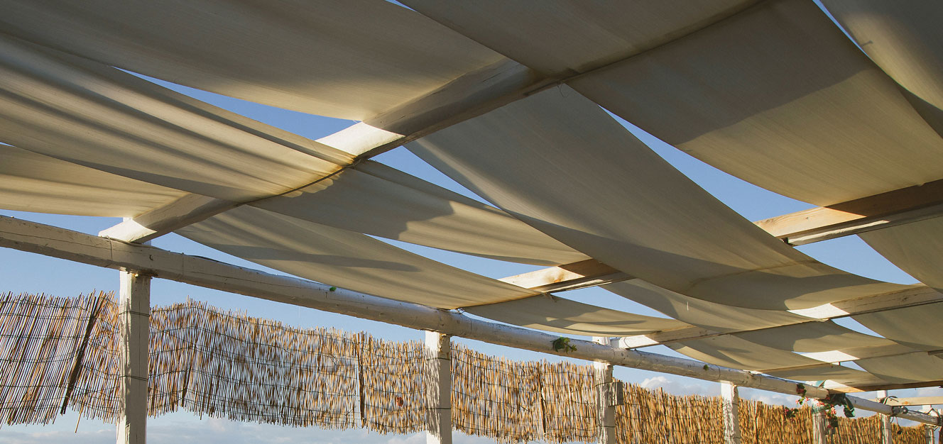 Toldos tensados de tejidos técnicos que crean sombra elegante y fresca.